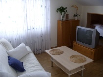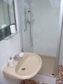 Das Schlafzimmer mit Schräge und angrenzendem Duschbad mit Waschbecken und WC besteht aus einem Einzelbett (90x200) und einem Sofa, das ausklappbar ist. Es kann als Schlafzimmer, aber auch als zusätzliches Wohnzimmer oder Spielzimmer für Kinder genutzt werden. In diesem Raum befindet sich ein zusätzlicher Fernseher.