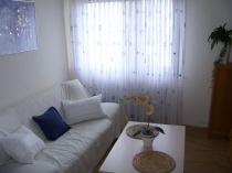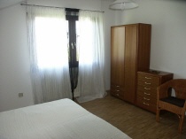 Das kleinere Schlafzimmer mit angrenzendem Duschbad mit Waschbecken und WC besteht aus einem Doppelbett (160x200), einem kleinen Schrank und einer Kommode.