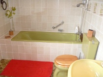 Das Bad ist ausgestattet mit Badewanne, Toilette, Waschbecken und Spiegelschrank und Fön.